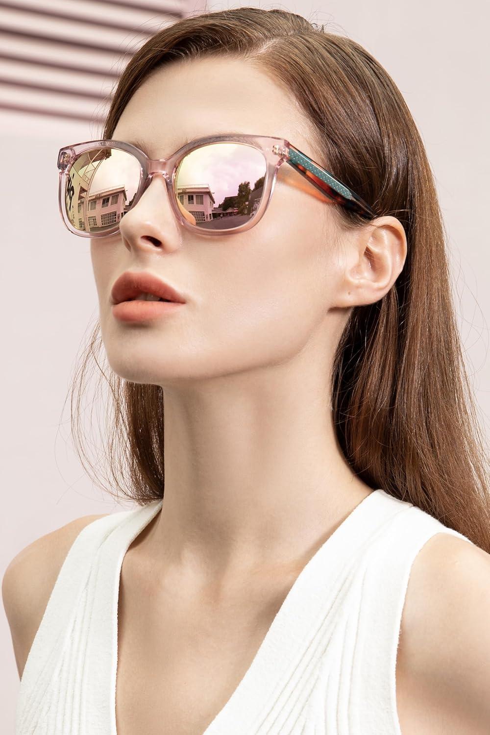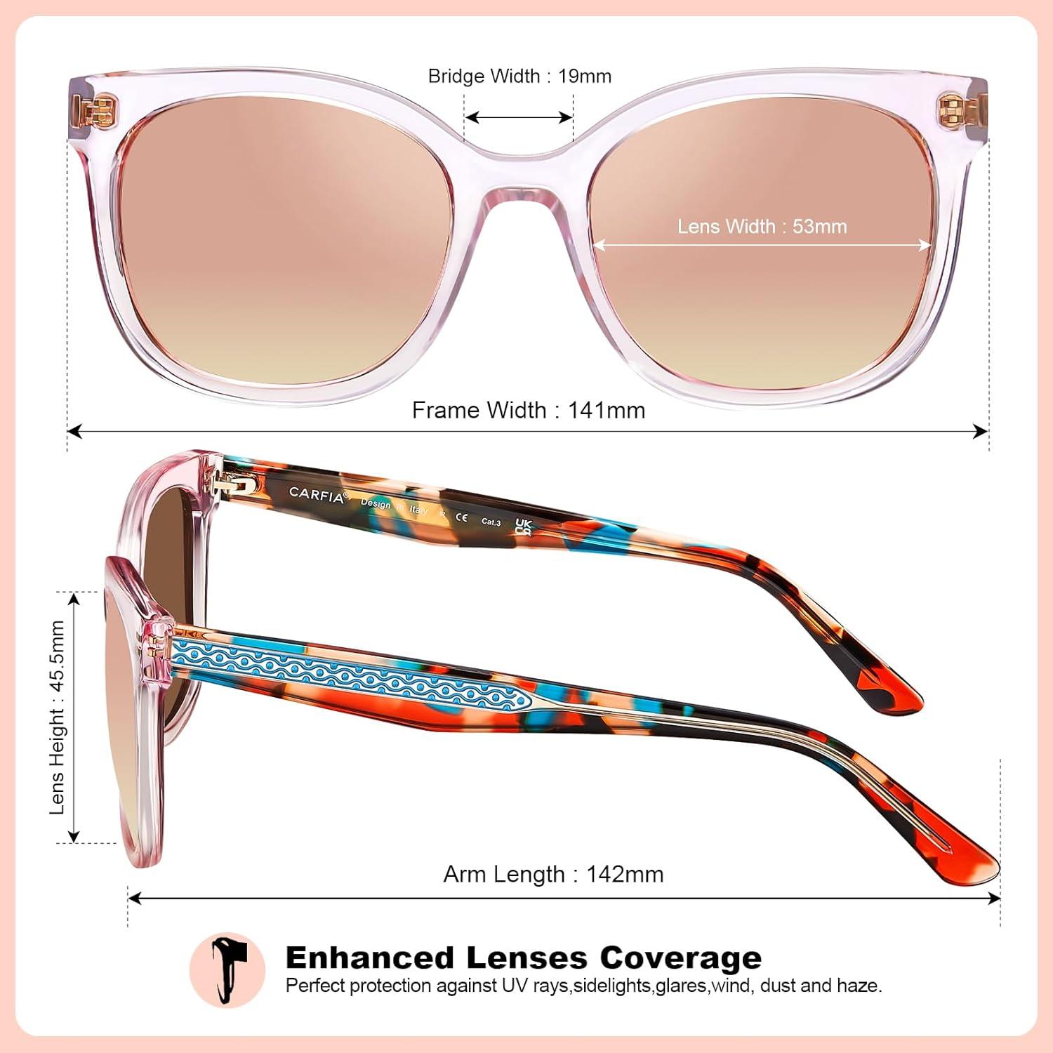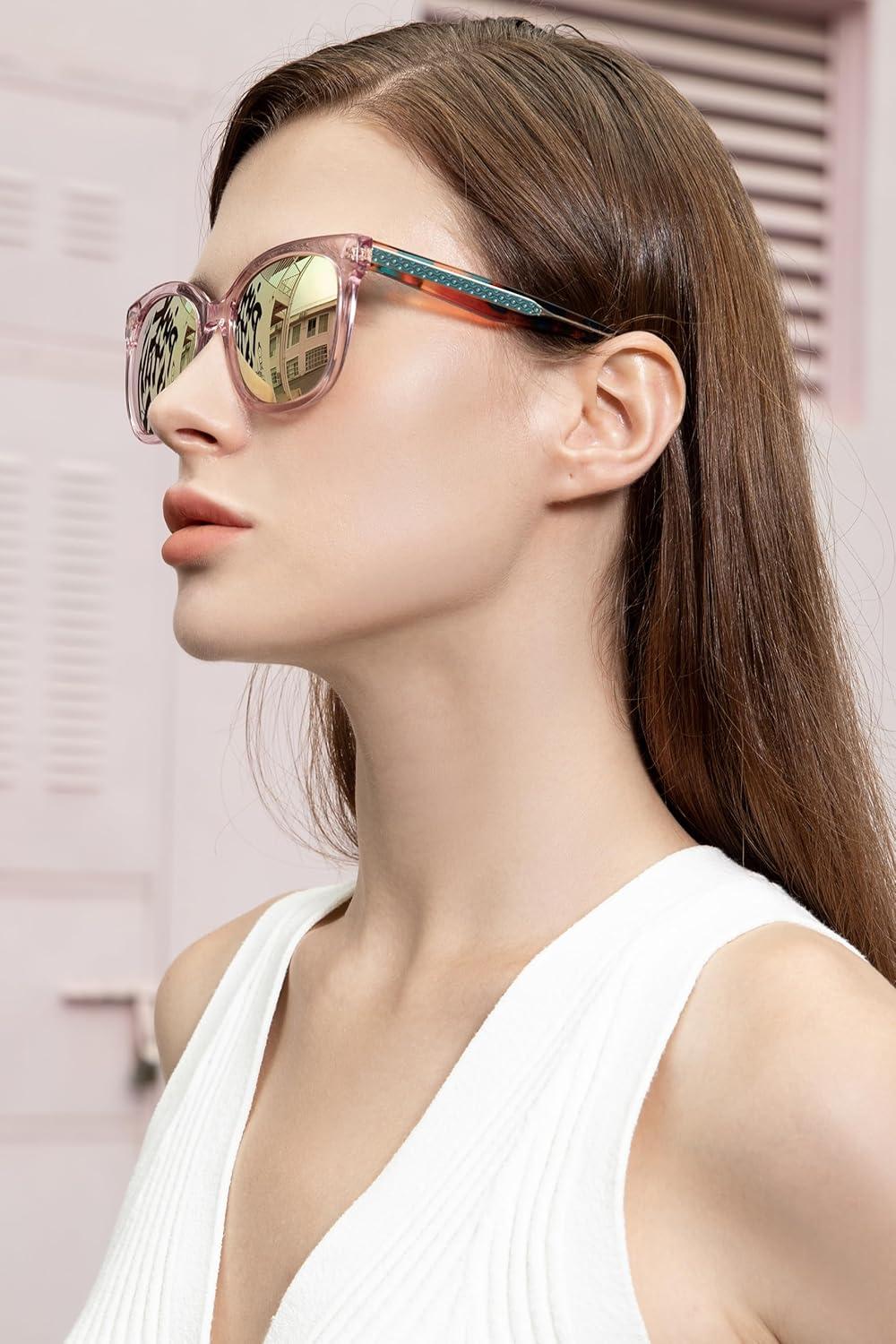 CARFIA Cat Eye Acetate Polarized Sunglasses for Women UV Protection, Retro Ladies Eyewears with Embossed Pattern Wire Core(4. Light Pink Frame + Pink Mirrored)