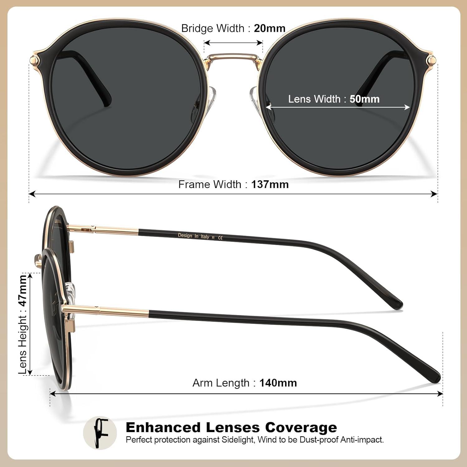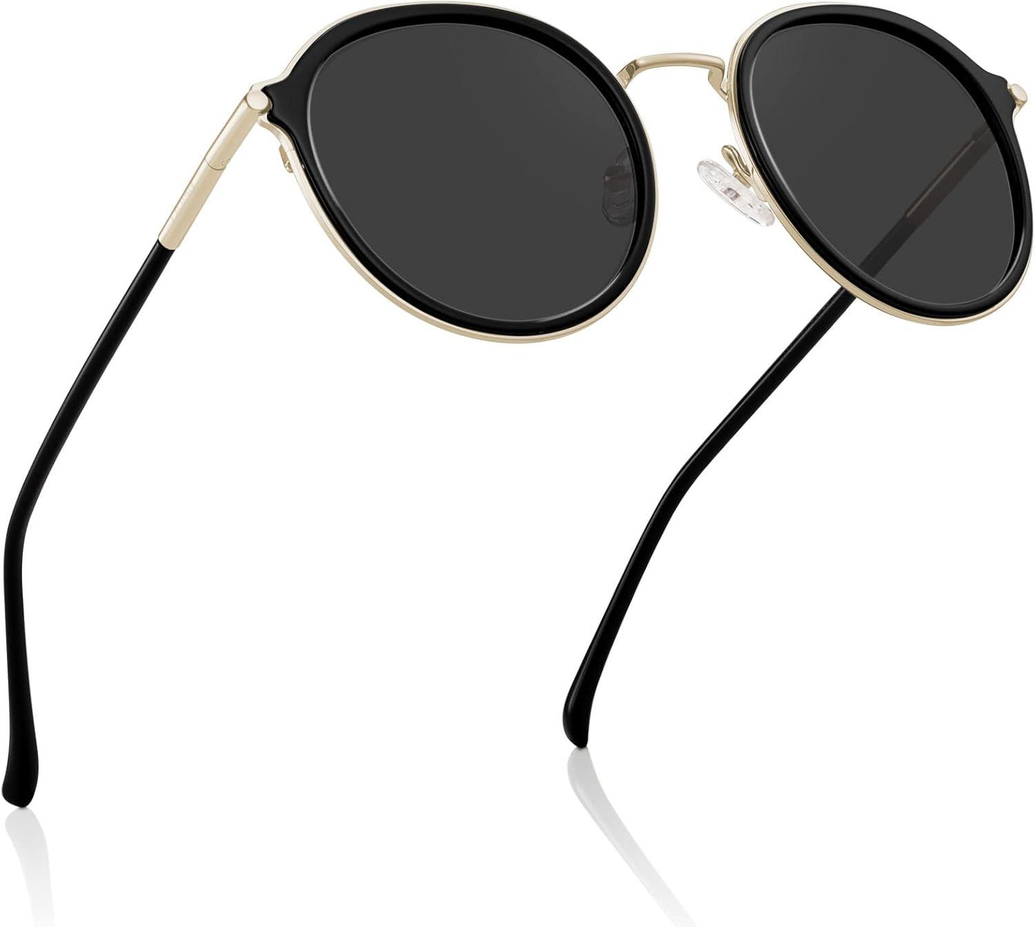 CARFIA Retro Acetate Polarized Sunglasses for Women UV Protection, Fashion Metal Brow Ladies Shades Eyewears Round Sunnies(1. Black Frame and Grey Lens)