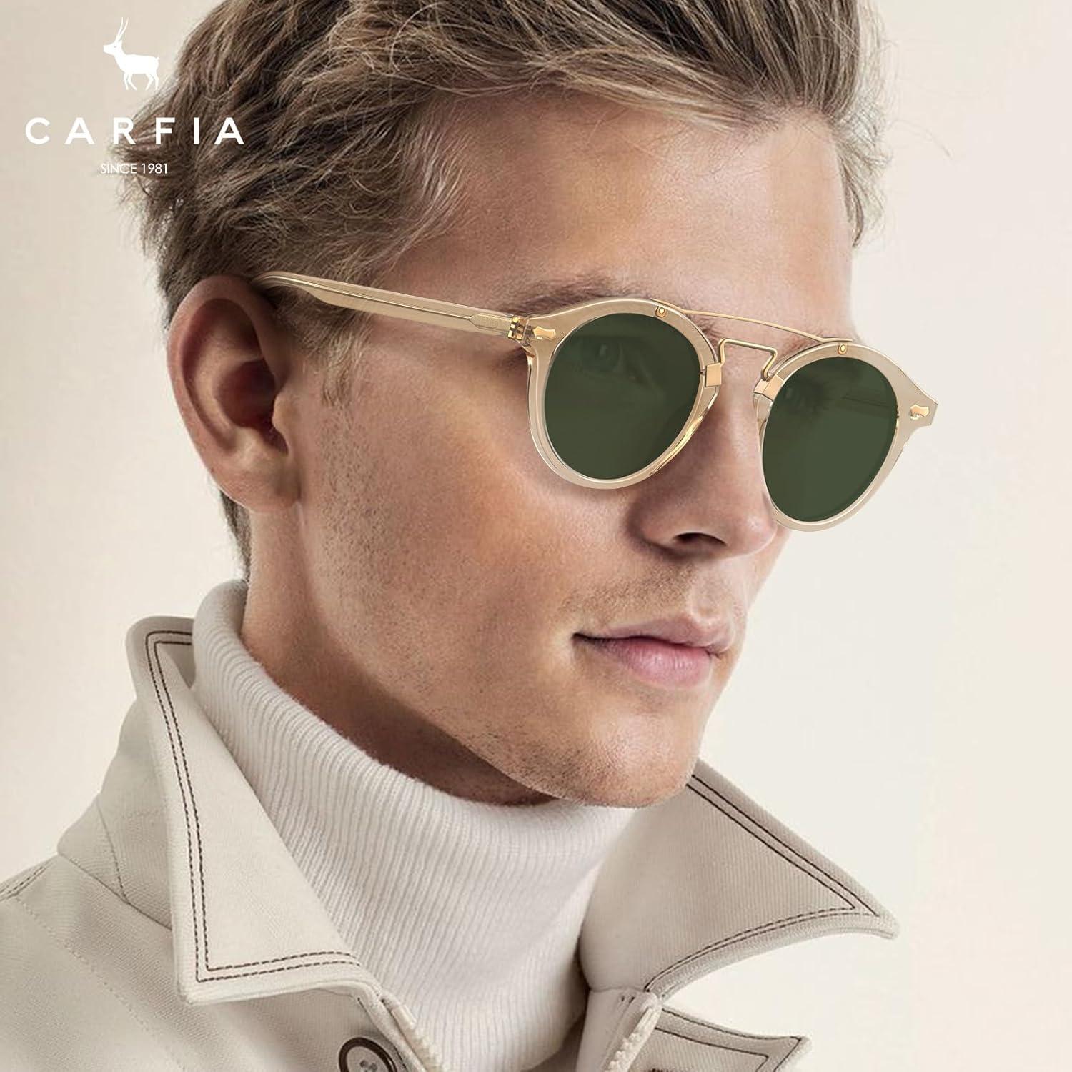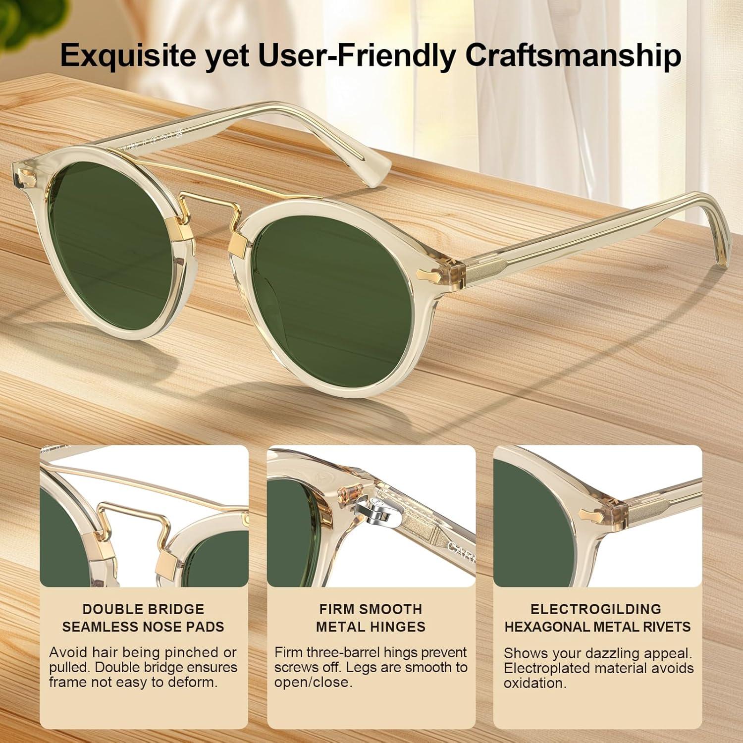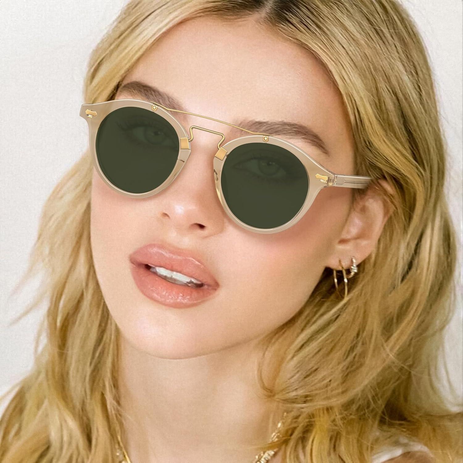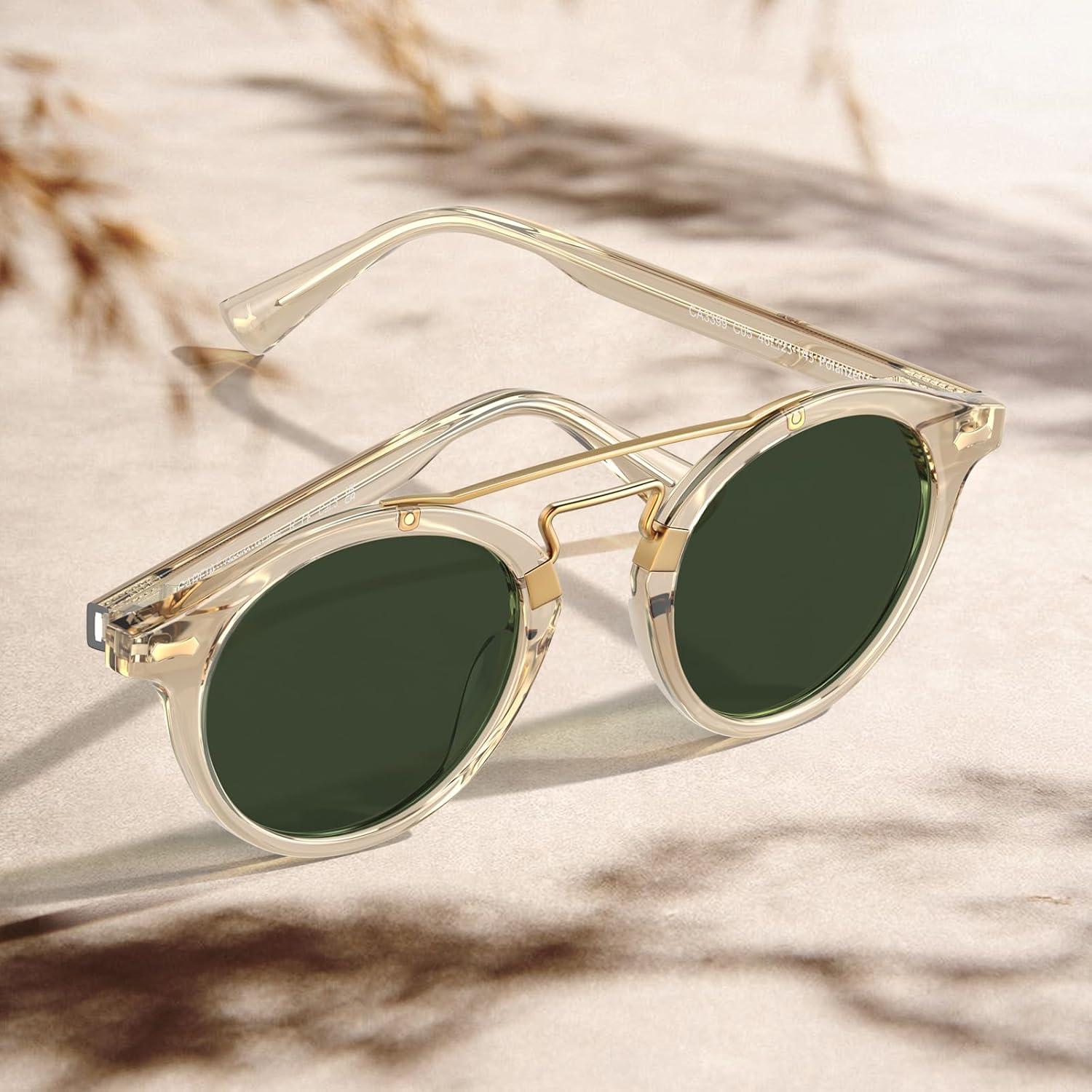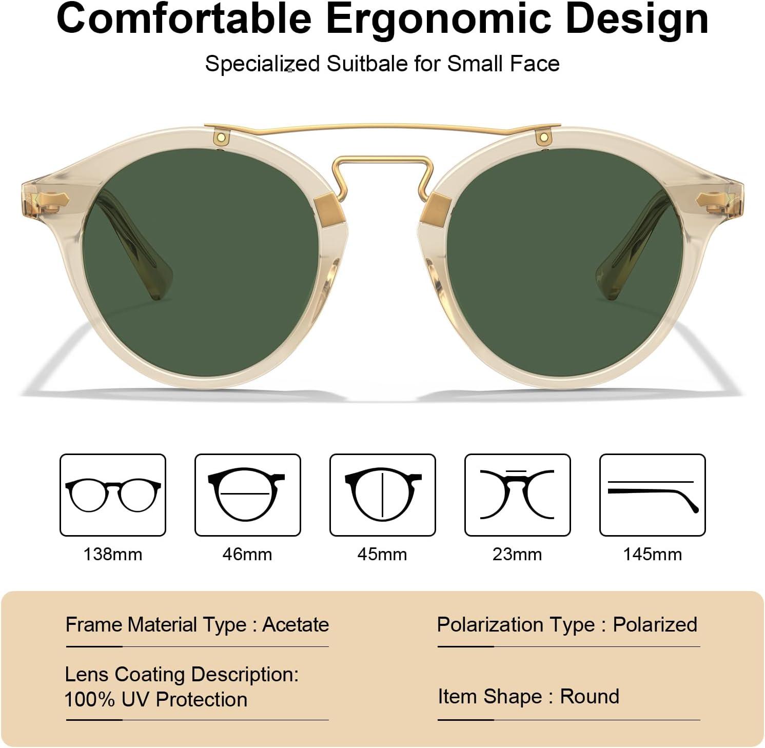 CARFIA Small Face Acetate Double Bridge Sunglasses for Women Polarized UV Protection, Retro Metal Brow Eyewears Round Sunnies(2. Clear Yellow Frame Green Lens)