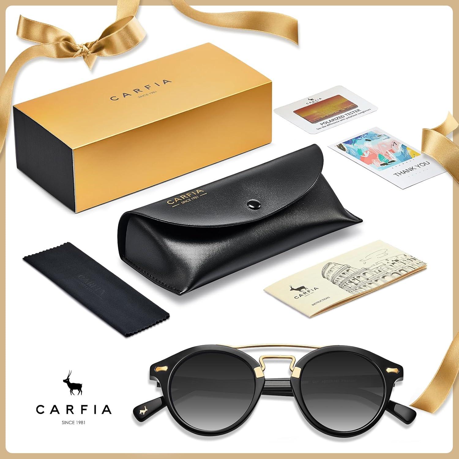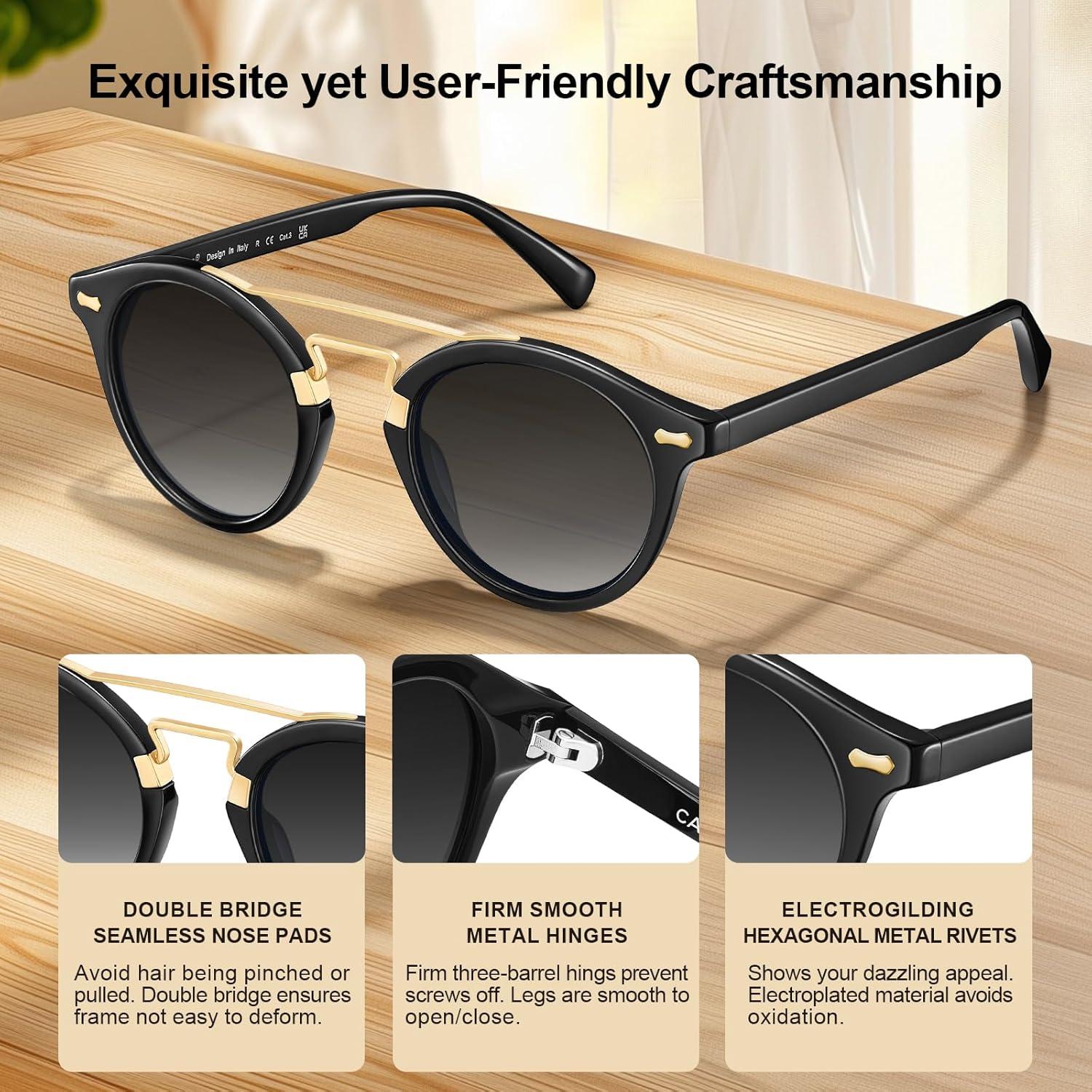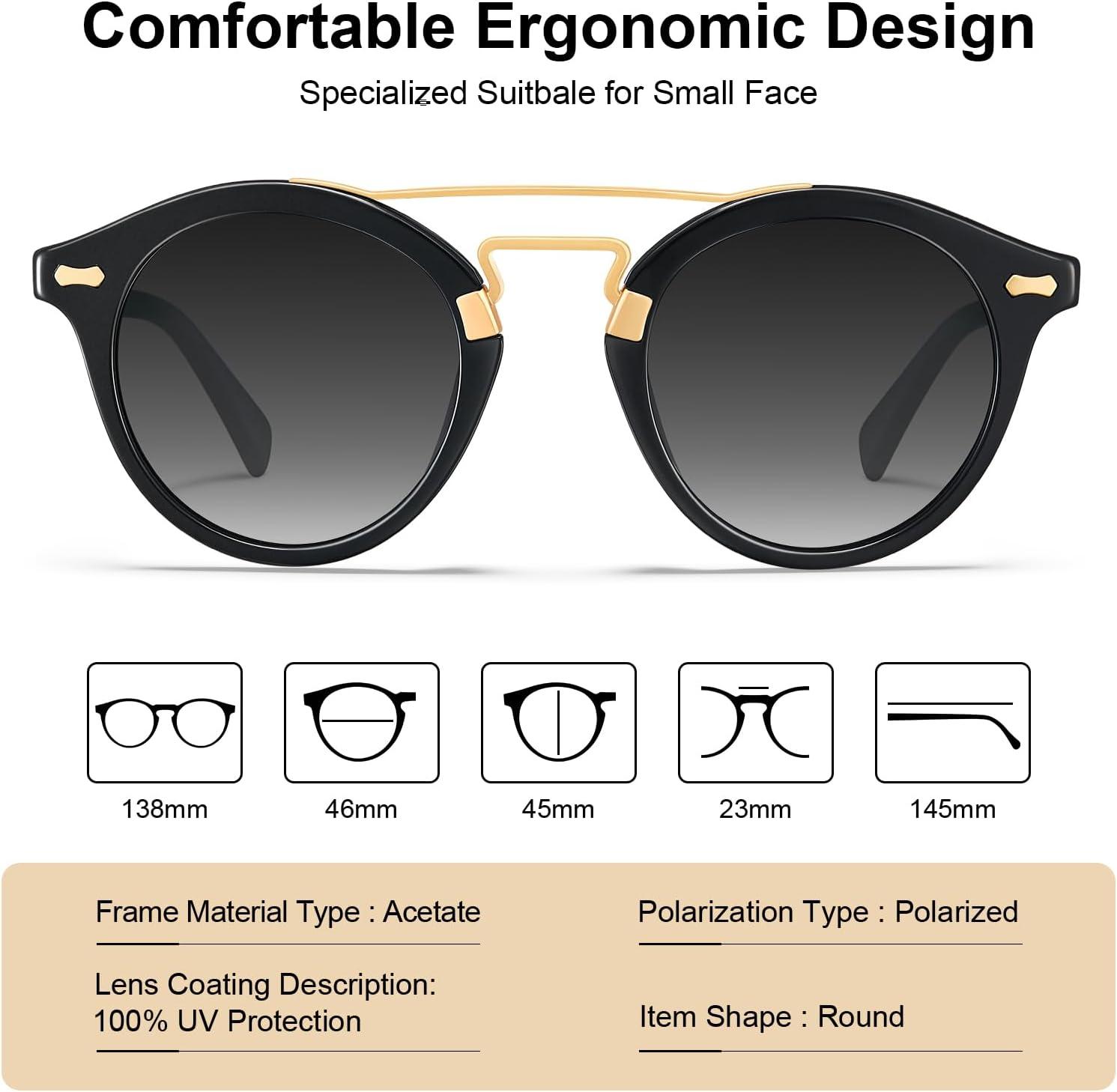 CARFIA Small Face Acetate Double Bridge Sunglasses for Women Polarized UV Protection, Retro Metal Brow Eyewears Round Sunnies(5. Black Frame Gradient Grey Lens)