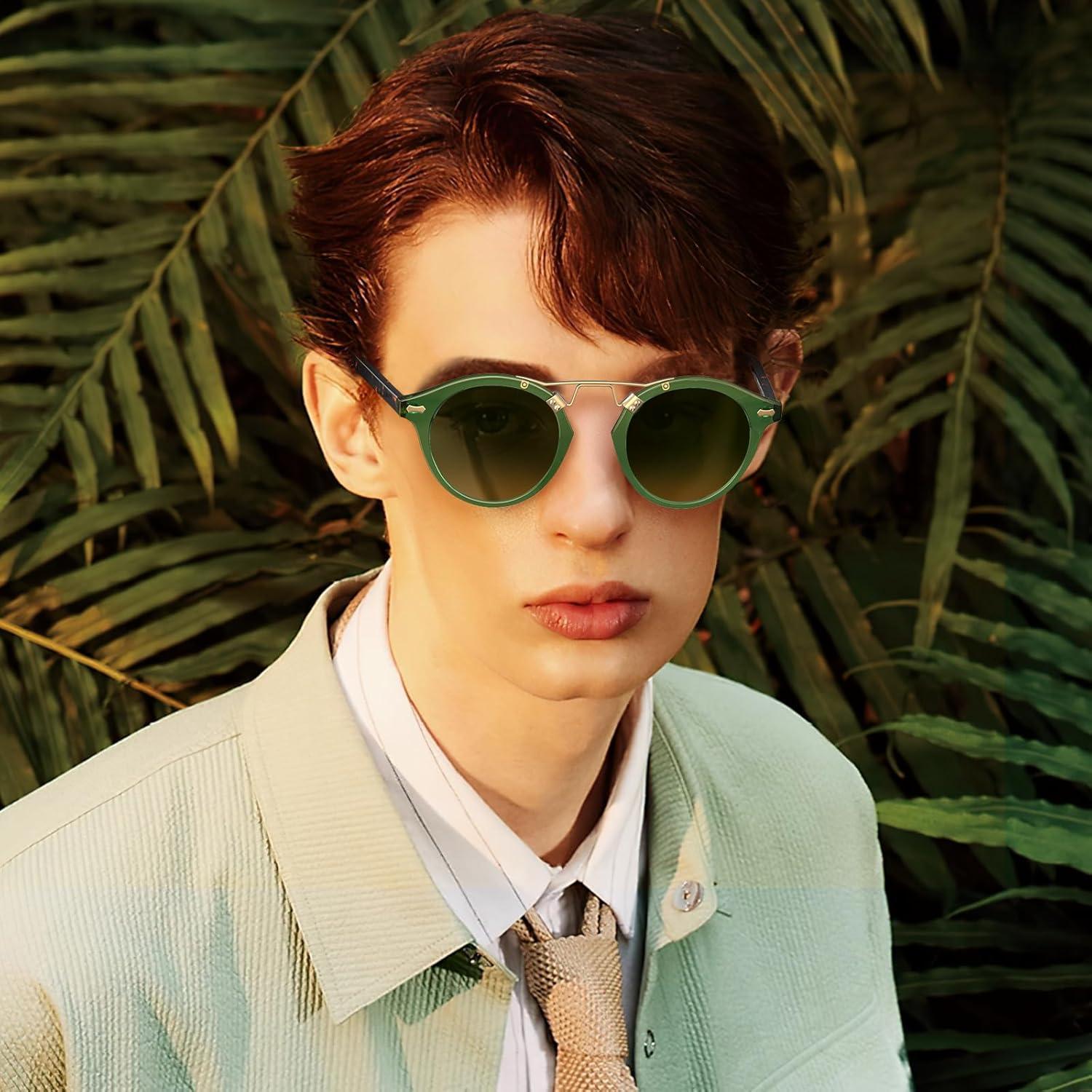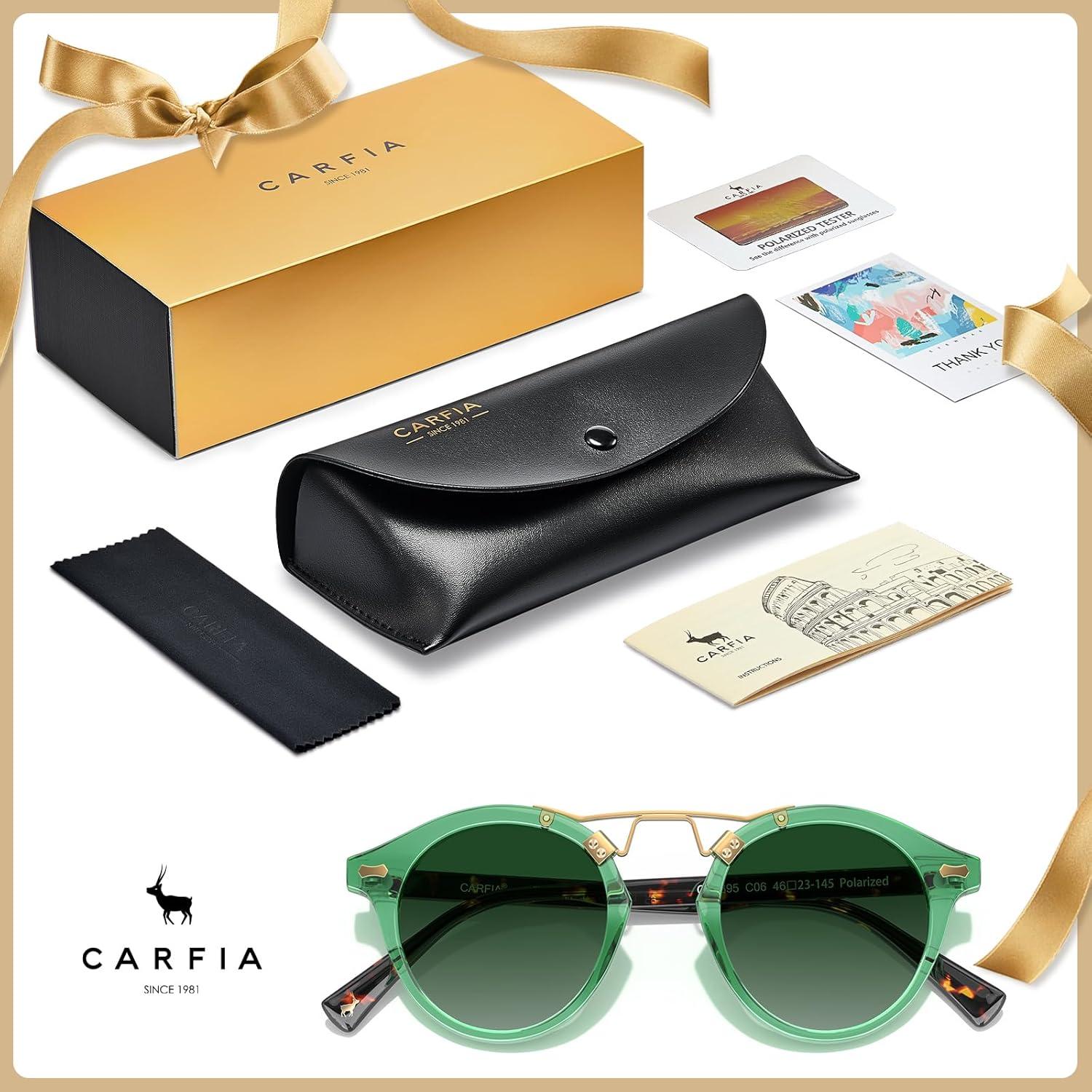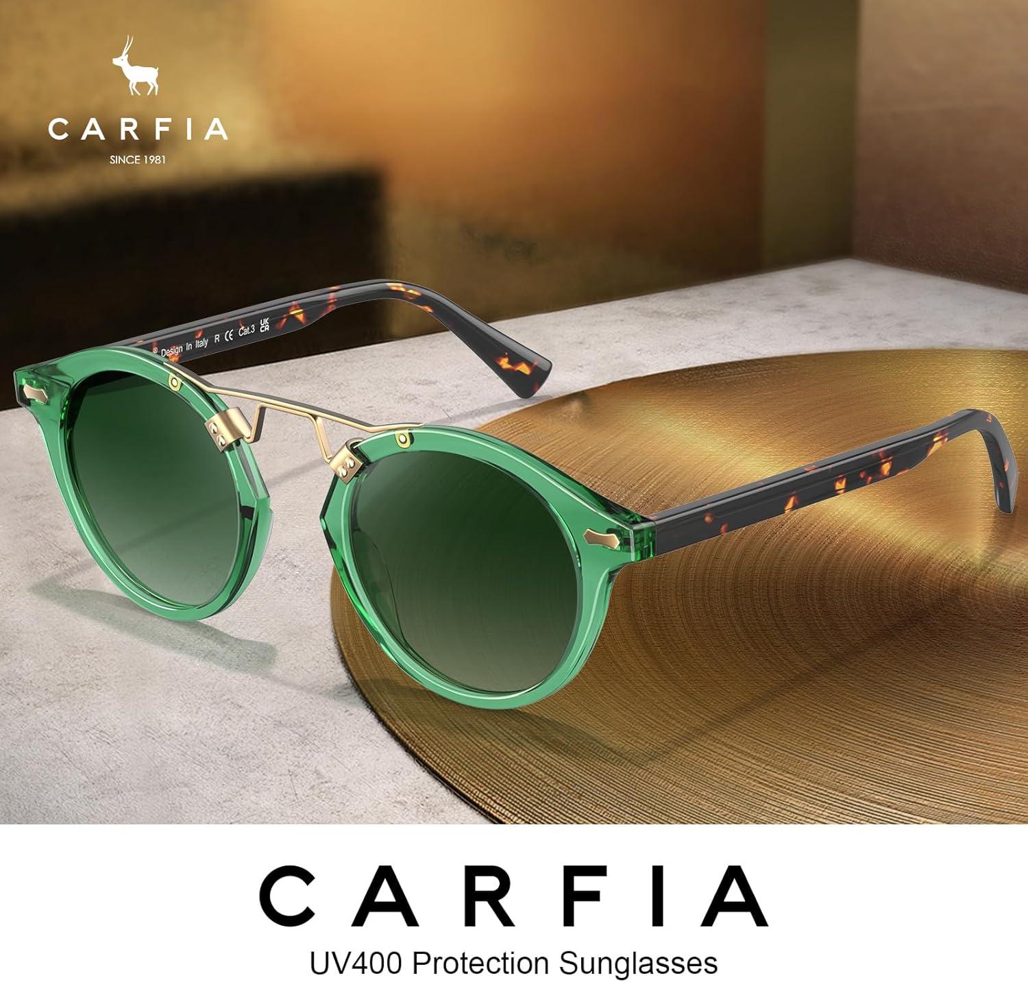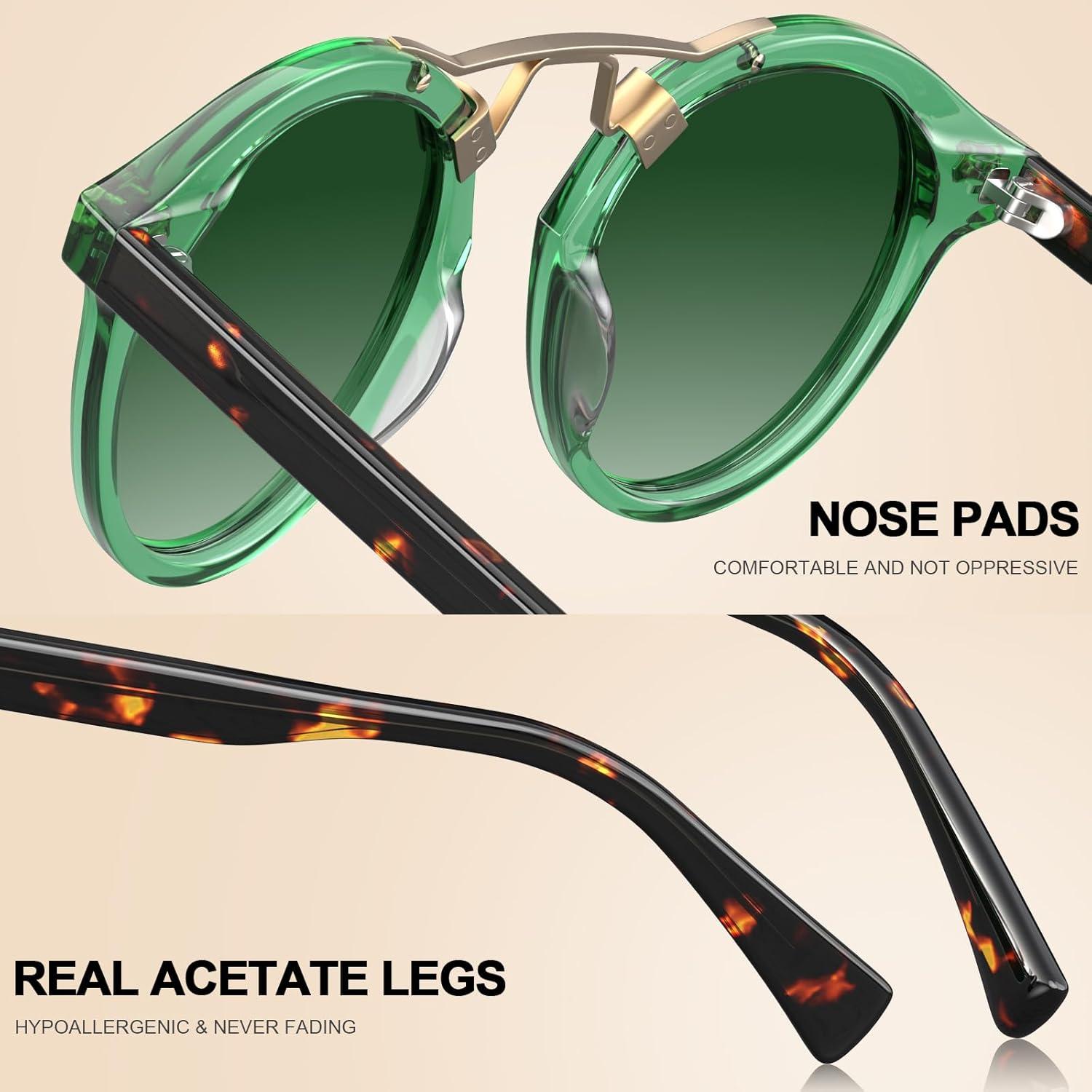 CARFIA Small Face Acetate Polarized Sunglasses for Women UV Protection, Retro Double Bridge Eyewears Metal Brow Round Sunnies(5-1. Translucent Green Frame Gradient Green Lens)